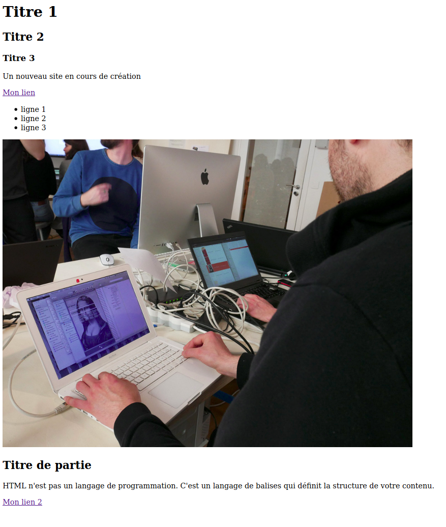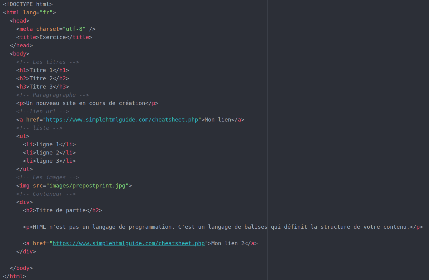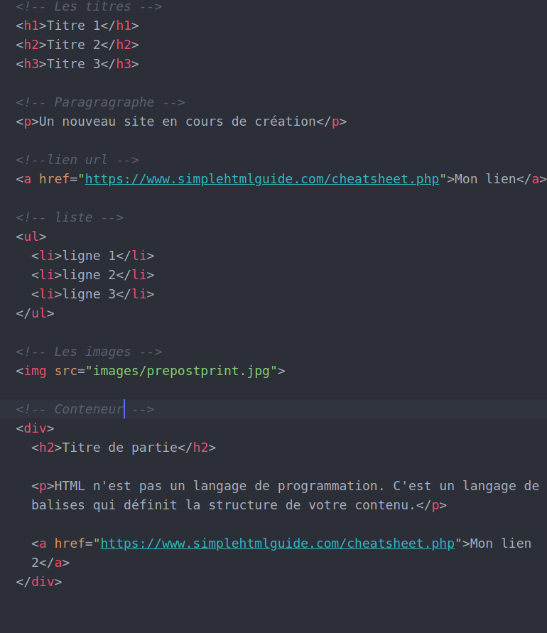 <!DOCTYPE html> : valide et détecte les erreurs de balisage<html></html> : balise encadrant toute la page web<head></head>; : balise d'entête, son contenu n'est pas affiché dans le navigateur, ses informations permettent au navigateur d'afficher la page correctement <meta charset="utf-8"> : définit le jeu de caractère à utiliser <title></title> : titre de la page<body></body> : représente le contenu principal du document HTML